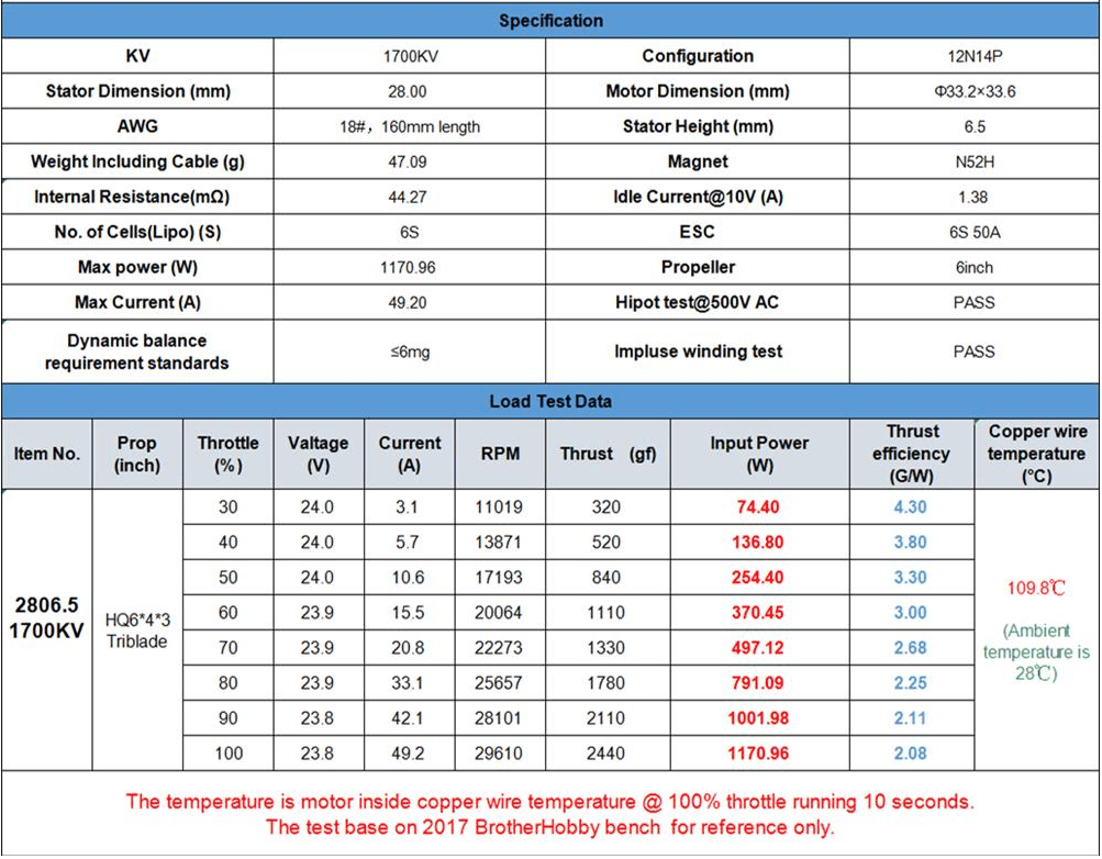 Précédemment, on a pu voir que la batterie ou même les hélices sont choisies en fonction des moteurs. Pour mieux comprendre comment faire ces choix, on prendra pour exemple le moteur Avenger en 2806.5-1700Kv de chez BrotherHobby. J’ai utilisé ces moteurs sur mon dernier quad en 6 pouces et alimenté en 6S. Rien que dans son nom, on peut souligner quelques caractéristiques importantes :